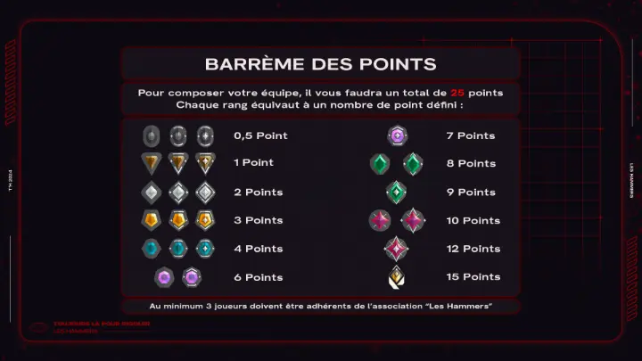 Un système de points par niveau/rank est mis en place afin de constituer des équipes équilibrées. Ainsi, pour se former, chaque équipe doit être composée de membres qui, avec tous leurs points additionnés, ne dépassent pas les 25 points.